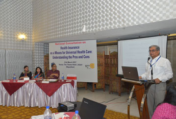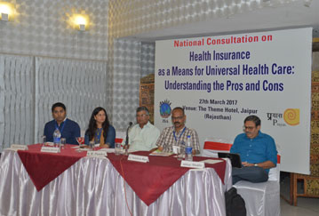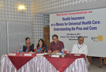 To deliberate around the above questions, Prayas along with Jan Swasthya Abhiyan (JSA) organised a National Consultation on “Health Insurance as a Means for Universal Health Care: Understanding the Pros and Cons“ on 27th March 2017 at The Theme Hotel in Jaipur (Rajasthan). The consultation tried to dissect deeper into the above mentioned dimensions of health insurance through productive dialogue. The event had participation from about 60 eminent experts on health and health insurance, policy makers and government representatives, members of civil society organisations and academicians from different parts of India including states such as Karnataka, Chhattisgarh, Kerala, Maharashtra, Andhra Pradesh, Gujarat, Delhi and of course Rajasthan.